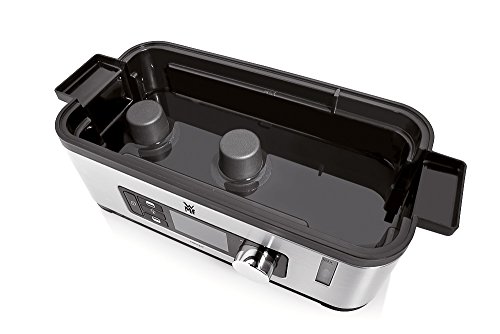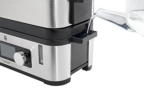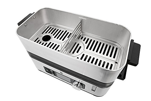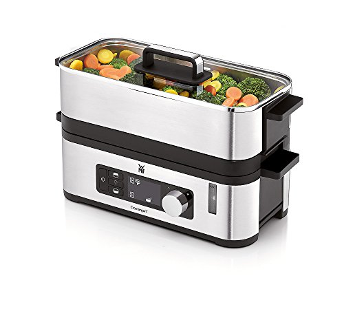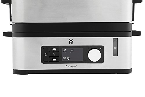 WMF 0415090011 è una pentola multifunzionale/vaporiera elettrica realizzata in acciaio inox Cromargan: ha una potenza di 900 W ed è formata da due scomparti regolabili individualmente e autonomamente, sia rispetto al tempo di cottura che all’intensità del vapore. Ognuno dei due scomparti presenta un divisore, in modo da poter preparare diversi alimenti all’interno della medesima zona di cottura.